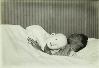 Tirage argentique d’époque de Bérénice Abbott représentant Jean Cocteau dormant dans un lit près d’un masque.