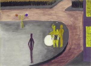 Aquarelle originale datée et signée au recto par Raymond Queneau, représentant une piste de cirque avec musiciens et haltérophiles.