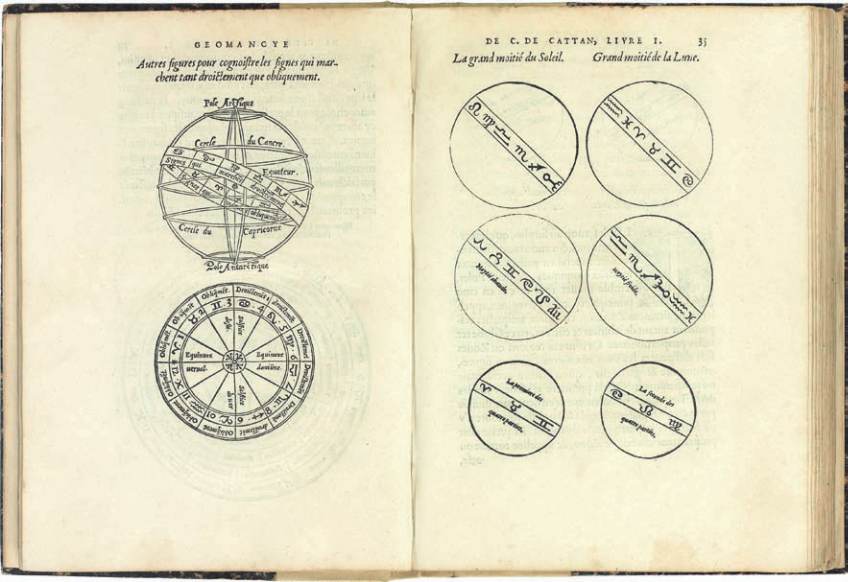 En tête l’auteur précise que “ Geomancye n’est autre chose qu’Astrologie ” et il illustre son traité de 19 FIGURES GRAVÉES SUR BOIS : SPHÈRES,