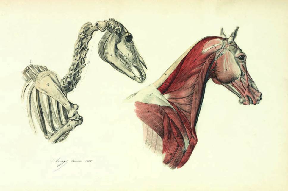 les os et les muscles du cheval y sont dessinés avec un soin, une précision extrêmes à la mine de plomb et au crayon gras relevés d'aquarelle.