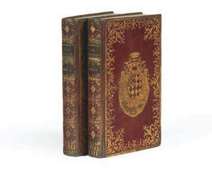 4 parties en 2 volumes in-12, maroquin rouge, dos lisses ornés de pièces d’armes dorées, pièces de titre et de tomaison de maroquin olive, jolie