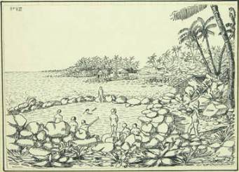 activités : abattant des arbres, transportant des troncs, piochant, assemblant des fagots, se baignant…