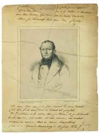 , portrait lithographié (par Van Giel, lith. de kaeppelin) de Fieschi, dédicacé en haut et en bas à Nina Lassave : “cet eccritture