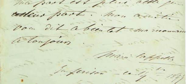 * On a relié ensuite trois lettres antérieures à sa condamnation, dont une rare lettre de jeunesse signée “Marie Capelle”, datée de Villers-Hellon