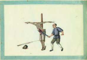 Carcan pour dettes, femme adultère, crucifixion, strangulation, lingchi (voir ci-dessous, nº 408), supplice de la planche, etc.