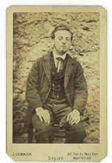 un portrait photographique sur papier albuminé collé, montrant l’accusé assis sur une chaise.