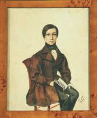 en redingote rayée, tenant dans sa main un livre aux tranches