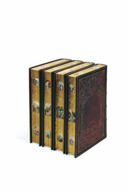 4 volumes grand in-8, chagrin prune, dos à quatre nerfs carrés ornés de caissons de filets dorés, quadruple