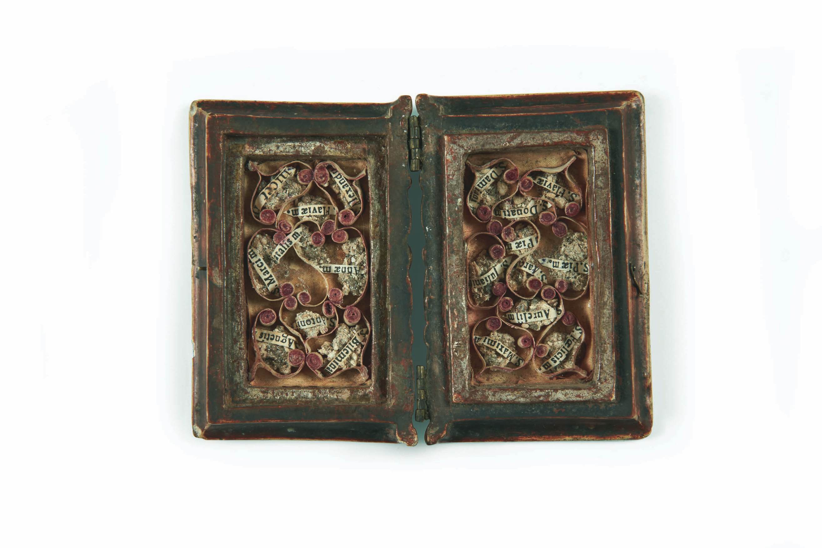 Curieux objet d’art populaire portatif imitant la forme d’un livre de poche.