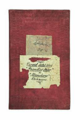recto seulement : vélin rigide teinté en rose et orné d’un décor estampé à froid, titres