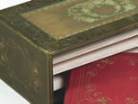 dorées ; boîte à compartiments de chagrin vert, plats ajourés ornés de tissus