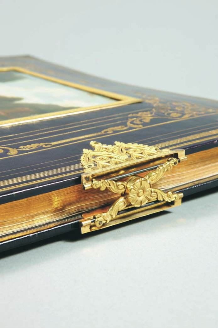 Ravissant spécimen de reliure romantique, décorée d’une jolie peinture sous verre : paysage