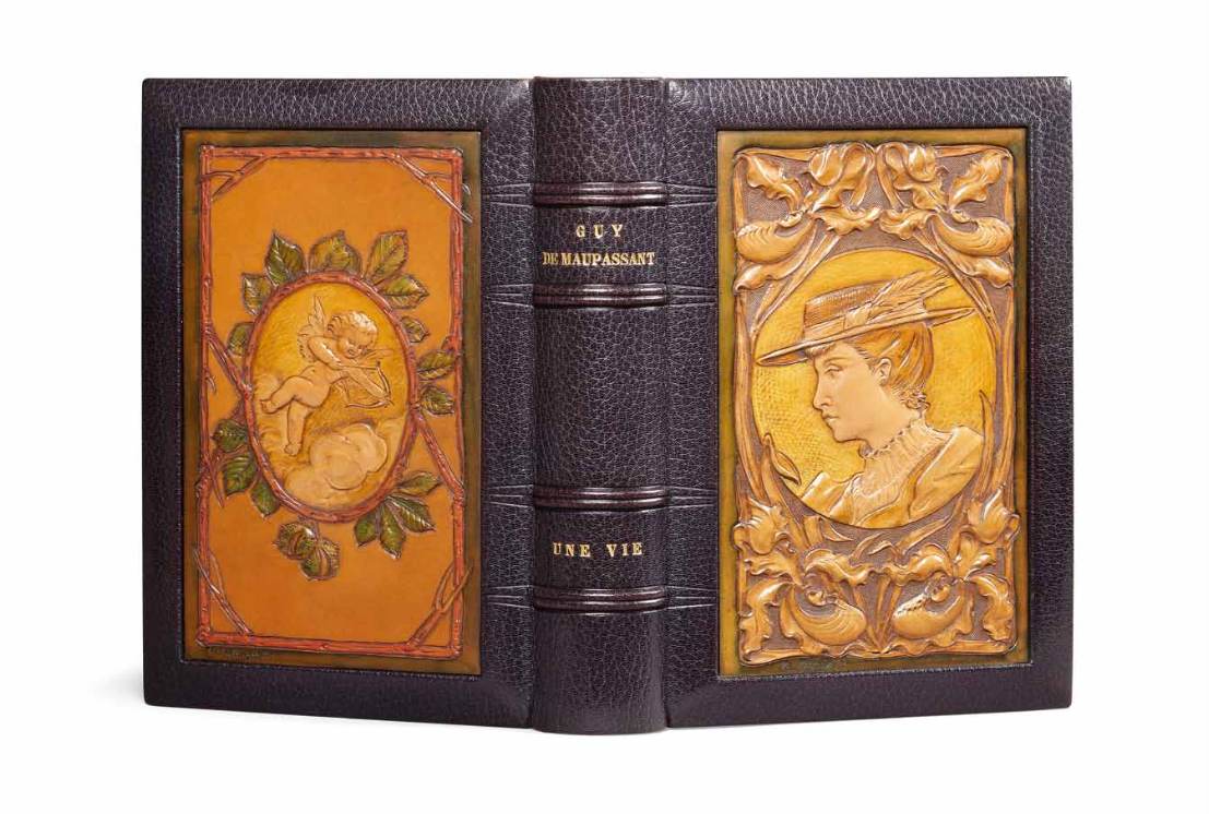 à nerfs orné d’un cygne mosaïqué. Tranches dorées. Encadrement