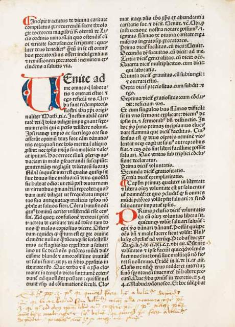 Impression gothique sur deux colonnes. Lettrines à l’encre rouge