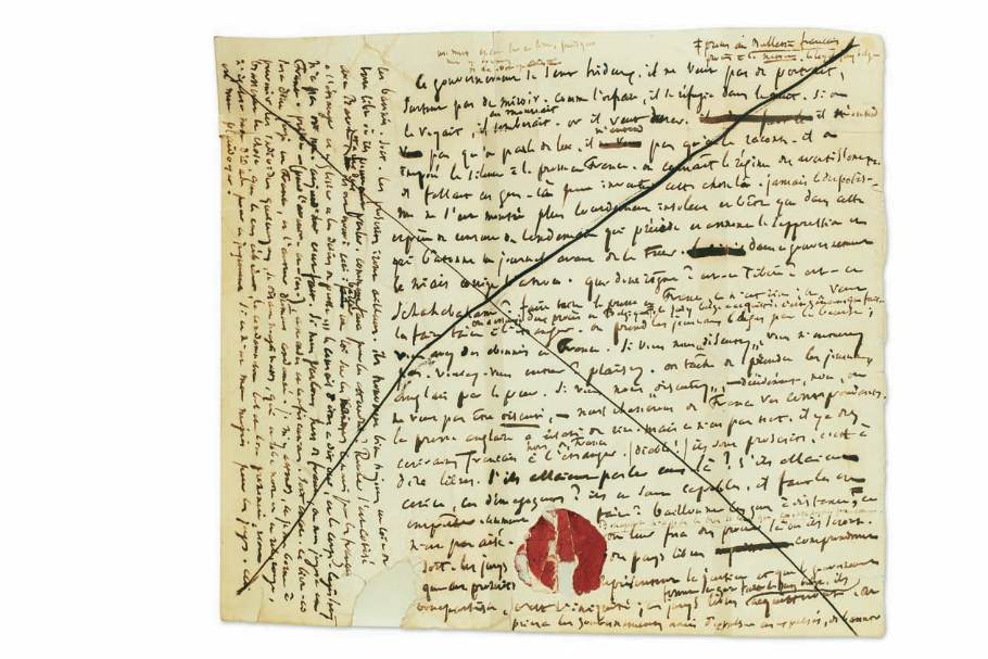 ratures et ajouts, l’ensemble du texte vigoureusement biffé en