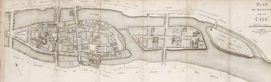 Les Recherches de Jaillot exhument tout le réseau des rues de l’ancien Paris à partir de l’étude des plans de ses prédécesseurs, de Merian (1615) à Robert de Vaugondy (1760). “Comme si désormais le récit ne suffsait plus et qu’il fallût voir, donc représenter la ville pour comprendre son développement, au cœur d’un mouvement plus vaste qui conduisait à inclure cartes et plans dans de nombreux ouvrages qui les ignoraient totalement jusqu’alors” (Boutier, p. 58).