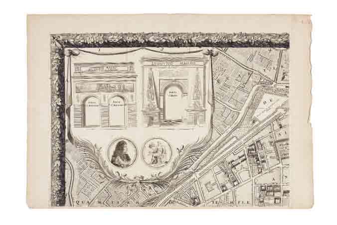 pouvant être assemblées pour former un plan de 1,90 m sur 1,90 m. Il s’agit du premier “plan projet”, c’est-à-dire confectionné pour étudier des projets et les y reporter. Cette édition de 1707 a été revue et augmentée sur l’édition de 1676 et représente un nombre beaucoup plus élevé d’édifces et de monuments tels que les couvents, les établissements publics et surtout les hôtels particuliers, présentés en vues perspectives. Y fgure par un trait pointillé la division de la ville en vingt quartiers de police, telle qu’elle a été fxée par édit en décembre 1702, avec les noms de chaque quartier. Le plan est encadré d’une large bordure de feuilles de chêne et illustré de grandes vignettes fgurant les 4 principales portes de Paris, de 2 médaillons contenant un portrait de Louis XIV et une allégorie de Lutèce, d’un plan des fontaines et d’une carte des environs de Paris.