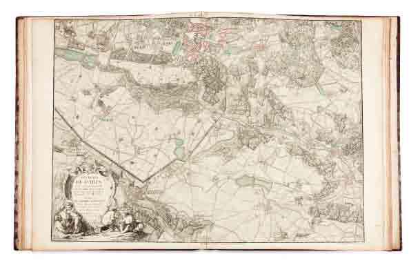 Recueil remarquable formant l’un des plus importants documents pour la connaissance de la région parisienne au XVIII e siècle. C’est le premier atlas qui donne une représentation exacte et très détaillée des villages, abbayes, châteaux, fermes, routes et chemins qui environnent la ville de Paris. C’est aussi le premier à fgurer l’hydrographie et le mode d’occupation du sol (espace construit, labours, prés, bois, vignes, cultures maraîchères et légumières) ainsi que divers objets du paysage (fourches patibulaires, regards, croix de carrefour, poteaux de seigneurie).