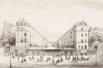 L’un des premiers projets de transport par chemin de fer dans la capitale. Limité au transport des marchandises, il avait pour but l’approvisionnement des Halles. “Sur le plan technique, l’auteur préconisait de s’abstenir de la vapeur et d’adopter plutôt un profl de voie en “montagnes russes” permettant la tractation par câble. Les grandes Compagnies de chemin de fer soutinrent le projet. Le Conseil municipal lui fut hostile, la Révolution de 1848 l’étouffa défnitivement” (Robert, Notre Métro , p. 13). Exemplaire tel que paru. Déchirures à la couverture.