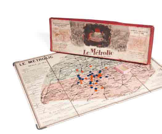 Très amusant jeu de société basé sur le plan du métro parisien, imprimé en couleurs, sur lequel sont indiquées les lignes en exploitation et les lignes à construire. “De chez vous, en vous amusant, apprenez à vous diriger dans Paris”. Le jeu se joue à deux, soit en service normal, chaque joueur disposant de 10 métros, soit aux heures d’affuence, chaque joueur disposant alors de 20 métros.