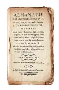 Almanach des demoiselles de Paris, de tout genre et de toutes les classes, ou calendrier du plaisir, contenant leurs noms, demeures, âges, tailles, fgures, et leurs autres appas (…) et le prix de leurs charmes. Corrigé, augmenté, et suivi des recherches profondes sur les flles angloises, espagnoles, italiennes et allemandes. A Paphos, de l’ imprimerie de l’amour [Paris] , 1792 . In-12, broché.