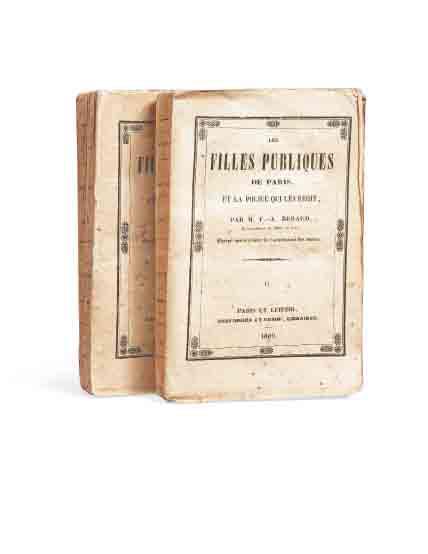 ÉRAUD (F.-F.-A.). Les Filles publiques de Paris et la police qui les git. Précédées d’une notice historique sur la prostitution chez les divers uples de la terre, par M.A.M. Paris et Leipzig, Desforges et Cie, 1839 . volumes in-8, brochés, couvertures imprimées et ornementées.