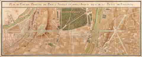 Ce plan, d’une très grande fnesse d’exécution, montre les parties cultivées, les jardins, les bassins, les alignements d’arbres, les chemins, les villages de Chaillot, Neuilly, Puteaux et Courbevoie, les châteaux de Madrid et des Ternes et les Invalides.