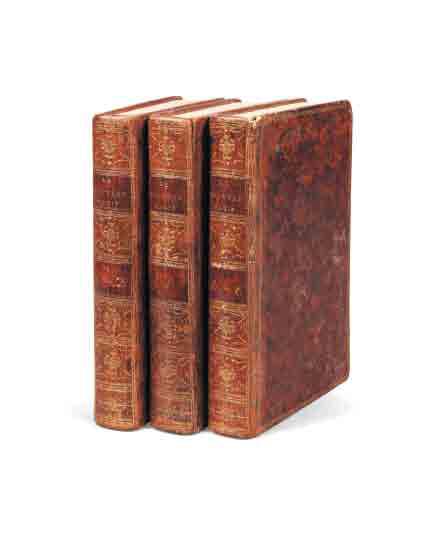 6 tomes en 3 volumes in-8, basane fauve marbrée, dos lisses richement ornés, pièces de titre de maroquin brun, roulette dorée encadrant les plats, coupes décorées, tranches jaspées (reliure de l’ époque).