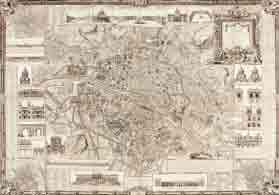Première édition. Grand plan de plus d’un mètre sur un mètre cinquante, encadré d’une large guirlande de feurs. Il est orné de 22 vues de places royales, de monuments historiques et monuments récents et de trois petits plans historiques fgurant Paris entre 1422 et 1643. Il offre un tracé assez exact des enceintes de Philippe Auguste, Charles V et Louis XIII. Avec table alphabétique. Le cartouche de titre est décoré des armes de Paris, des armes du gouverneur de Paris tenues par Minerve et des armes du prévot des marchands tenues par une femme symbolisant Paris.