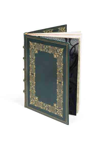 ets et feurons dorés, large bordure intérieure décorée, doublures rdes de soie brochée noire, non rogné, tête dorée, couvertures et onservés, étui