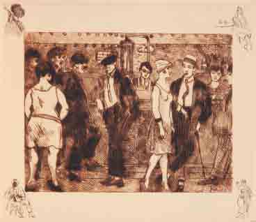 20 eaux-fortes hors texte d’Assire, avec remarques, tirées en bistre ou en bleu. Elles illustrent le Paris canaille de Mac-Orlan : bals, bistrots, prostituées, le Moulin Rouge, etc.