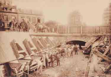 3 superbes photographies de H.C. Godefroy montées sur carton fort avec titres et légendes sur des languettes de papier collées : Construction du chemin de fer métropolitain municipal de Paris, Ligne circulaire, 7º lot.