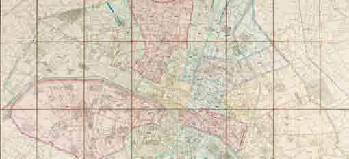 Grand plan de Paris dressé en 1856 par Girard, géographe des postes. La ville est divisée en 12 municipalités, chacune aquarellée d’une couleur. Les noms des 48 sections (4 par municipalité) sont inscrits sur des petits drapeaux, également aquarellés. Le plan est accompagné d’une brochure contenant la table alphabétique des rues et la liste des lignes omnibus.