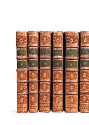 21 parties et une table à paginations séparées en 7 volumes in-8, veau jaspé, dos à nerfs ornés, pièces de titre et de tomaison de maroquin vert, triple flet doré encadrant les plats, coupes et bordures intérieures décorées, tranches marbrées (reliure de l’ époque).