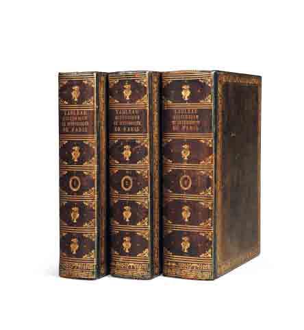 3 volumes in-4, veau olive, dos lisses ornés, encadrement de flets et roulette dorés sur les plats, coupes et bordures intérieures décorées, tranches dorées (reliure de l’ époque).