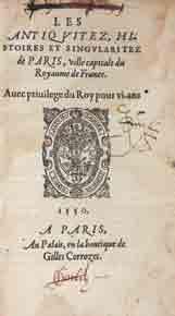CORROZET (Gilles). Les Antiquitez, histoires et singularitez de Paris, ville capitale du Royaume de France. Avec privilege du Roy pour VI ans. A Paris, au Palais, en la boutique de Gilles Corrozet, 1550.