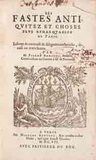 BONFONS (Pierre). Les Fastes antiquitez et choses plus remarquables de Paris. Labeur de curieuse & diligente recherche, divisé en trois livres. Paris, Nicolas Bonfons, 1607.