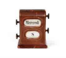 Calendrier éphéméride en cuir brun en forme de borne ; hauteur