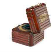 Encrier de voyage en bois clouté ; hauteur 8 cm, largeur 10x10 cm.