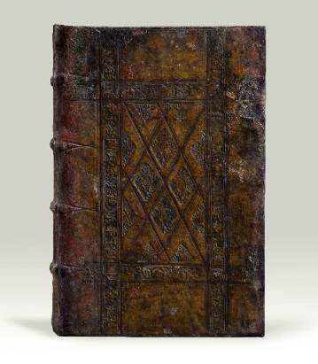 in-folio, veau brun clair estampé à froid sur ais de bois, filets se croisant autour des plats et formant un cartouche