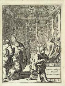 Très beau frontispice représentant les auteurs réunis dans une bibliothèque, gravé sur cuivre et répété en tête de chaque