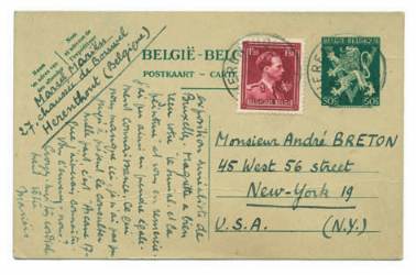 391. MARIEN Marcel. CARTE POSTALE AUTOGRAPHE SIGNÉE ÀANDRÉ BRETON. Bruxelles, 15 février 1946.
