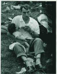 Tirage argentique d’époque de André Martin représentant un homme assis, cigare à la bouche, donnant le biberon à