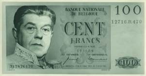 Collage original contrecollé sur tirage d’époque représentant le visage de René Magritte sur un billet de 100 francs belge.