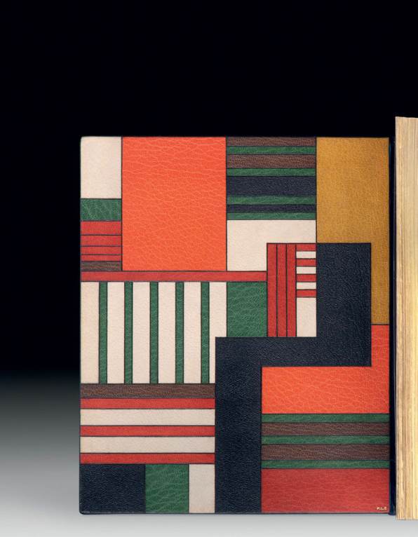 dos lisse et muet, doublure bord à bord ornée d’un décor géométrique de pièces rectangulaires et