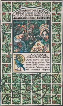 initiale rehaussée d’or, le texte de 11 grandes initiales en couleurs et or, 20 vignettes imprimées en gris bleu.