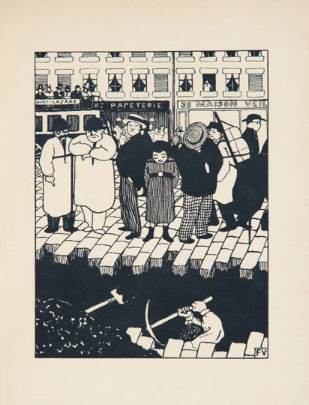 représentant un sergent de ville sous un réverbère, d’où pend une pièce mosaïquée portant le titre,