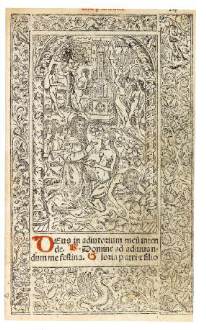 bois dans le texte. Le titre, imprimé en rouge, orné d’un bois, le Christ à côté des emblèmes de la Passion.