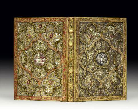 dos de cuir brun couvert d'or et peint, plats ornés de caissons en creux couverts d'entrelacs de bois en relief peints
