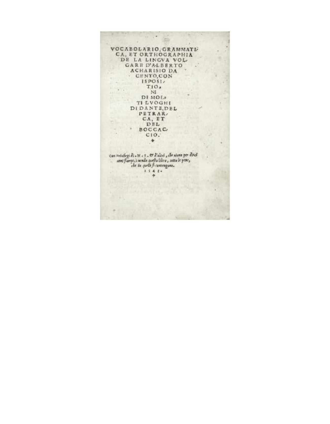 Rare première édition de cet important recueil sur la langue italienne, composé par le philologue Alberto Acarisio